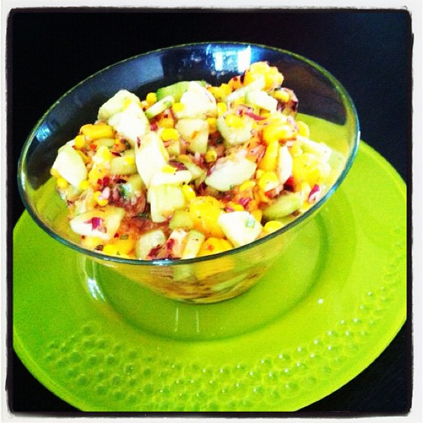 Schil de komkommer, verwijder de zaadlijsten en snij de komkommer in blokjes. Schil de mango met een dunschiller en snijdt de mango ook in blokjes. Snipper de rode ui. Haal de korrels van de maïskolf. Mix de komkommer, mango, rode ui en de mais in een schaal.