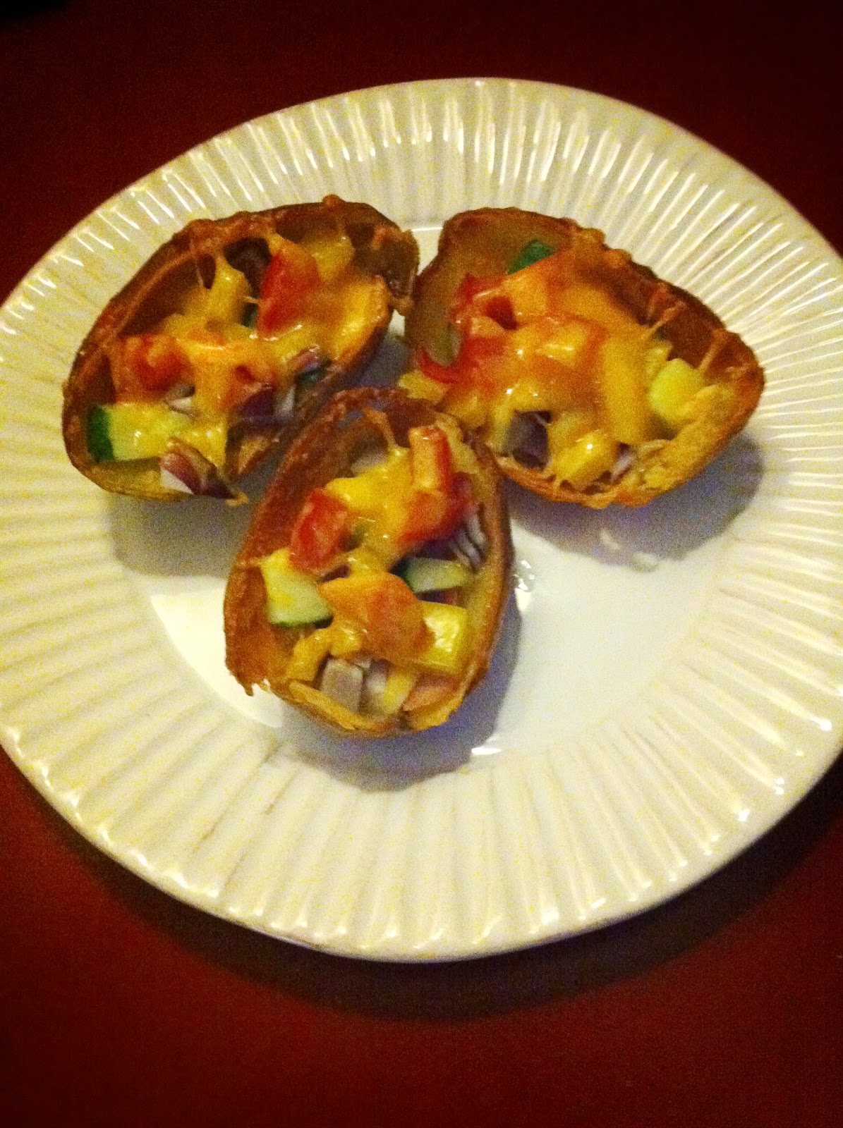 Gekookte aardappels, ik kan er niks mee. Ik vind ze droog en saai en kan er geen culinaire uitspattingen in kwijt. Maar een lekkere zelfgemaakte aardappelpuree of gebakken aardappelen vind ik dan wel weer lekker. Vanavond maakte ik “crazy” baked potato skins. “Crazy” omdat ik de vulling maakte met van alles en nog wat wat ik uit de koelkast opduikelde. Potato skins zijn gevulde en gebakken aardappelschillen, het is van origine een Amerikaans recept.
