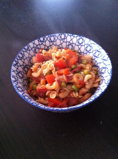 Kook de pasta volgens de aanwijzingen van de verpakking. Verwarm een pan op het vuur. Voeg een klein scheutje olijfolie toe en bak hierin de salami 1 a 2 minuten. Voeg de paprika toe en bak deze kort mee. Voeg de tomatenblokjes toe, vul het lege blik tot halverwege met water en voeg toe. Voeg de boter en de kruiden toe en roer door. Voeg de witte bonen en de doperwten toe en laat licht doorkoken tot de pasta gaar is. Giet de pasta af (bewaar iets van het kookvocht) en roer de pasta door de saus. Serveer in een kom en verdeel de geraspte kaas erover.